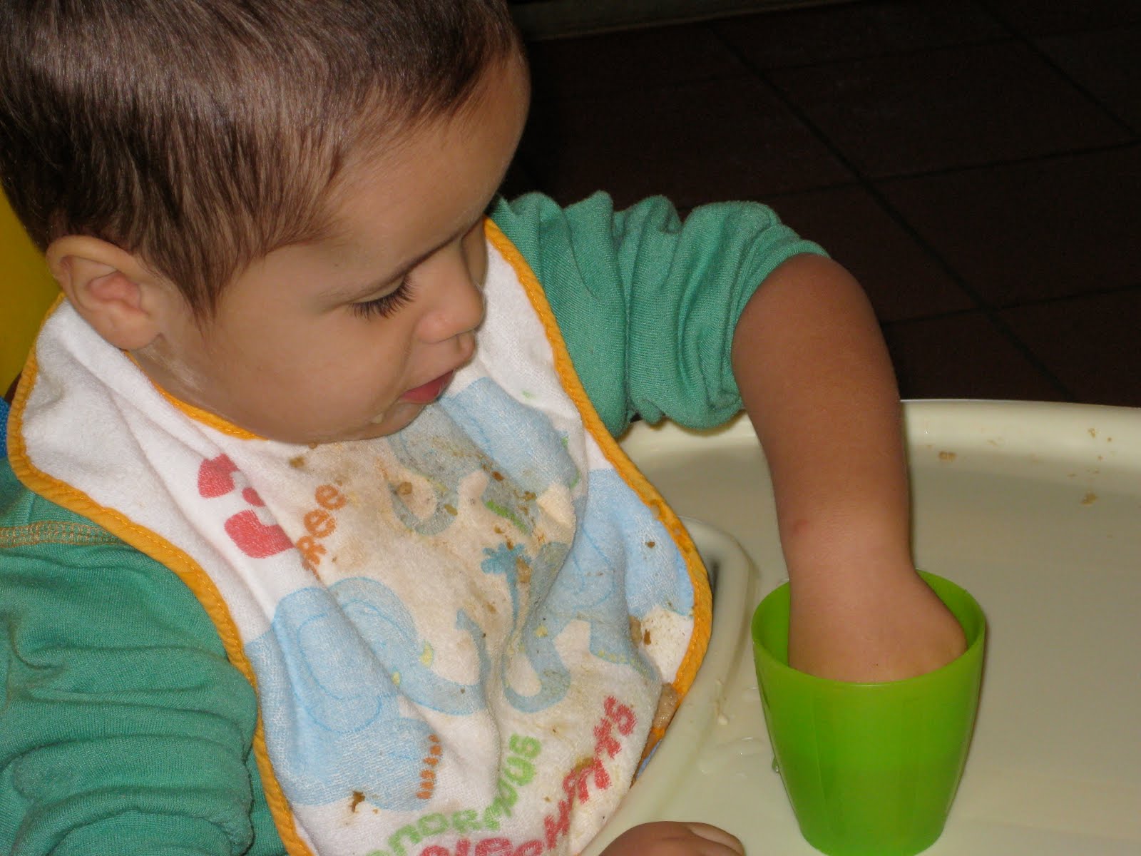 He stuck his hand inside his cup of water and was swishing it around. He'd take his hand out and look at how the water droplets dripped off. He'd smile at it, and put his hand in again. It was so cute. He has never done this before.